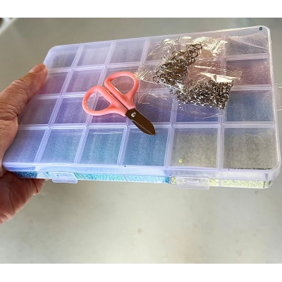 Boks med 24 forskellige farver glas seed beads - ca. 20.000 stk.