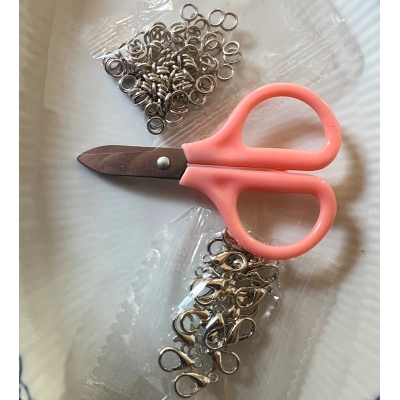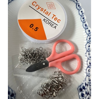 Der medfølger tillige låse, øskner, en lille saks samt en rulle elastiktråd.