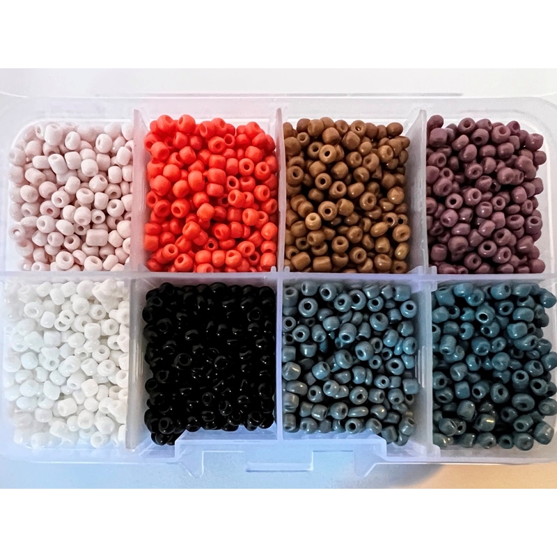 Boks med 8 forskellige farver glas seed beads - ca. 3.400 stk.