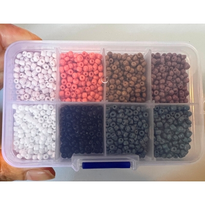 Boks med 8 forskellige farver glas seed beads - ca. 3.400 stk. Str. ca. 3 mm. Hul str. ca. 1 mm. Prisen er for en boks.