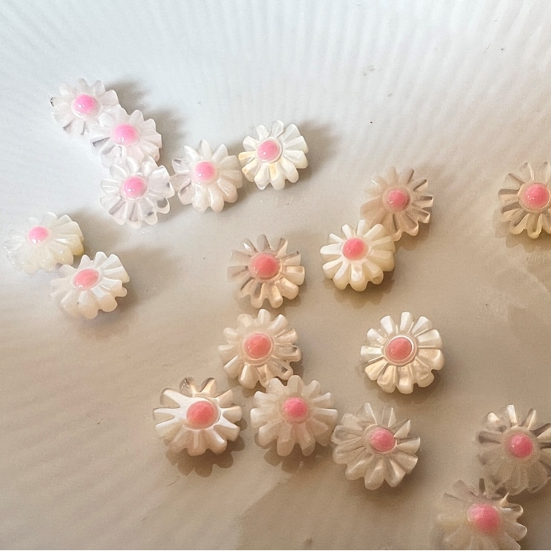 Blomst af shell pearls med lilla farvet emalje. Str. ca. 10 mm. Hul str. ca. 0,7 mm. Prisen er for 1 stk.