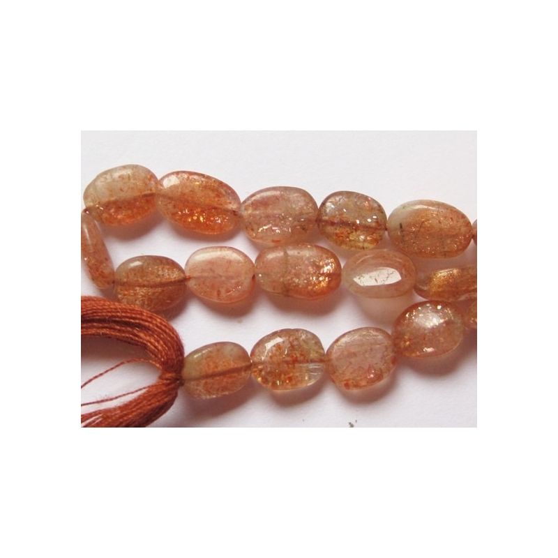 Facetslebne flade perler af sun stone. Str.: ca. 2-3 x 5 mm. Hulstr.: ca. 0,5 mm. Antal på streng: ca. 130 stk. Prisen er for 1 streng.