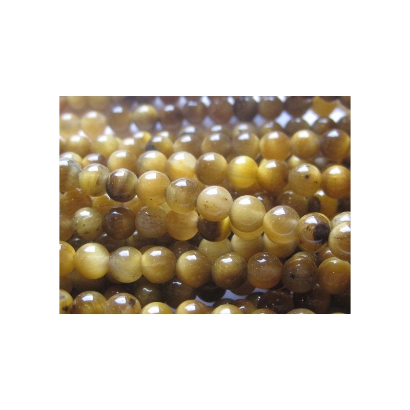 Runde perler af tigerøje. Str.: ca. 6 mm. Hul str.: ca. 1 mm. Antal på streng: ca. 65 stk. Prisen er for 1 streng.