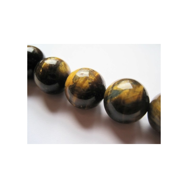 Runde perler af tigerøje. Str.: ca. 12 mm. Hul str.: ca. 1,2 mm. Antal på streng: ca. 33 stk. Prisen er for 1 streng.
