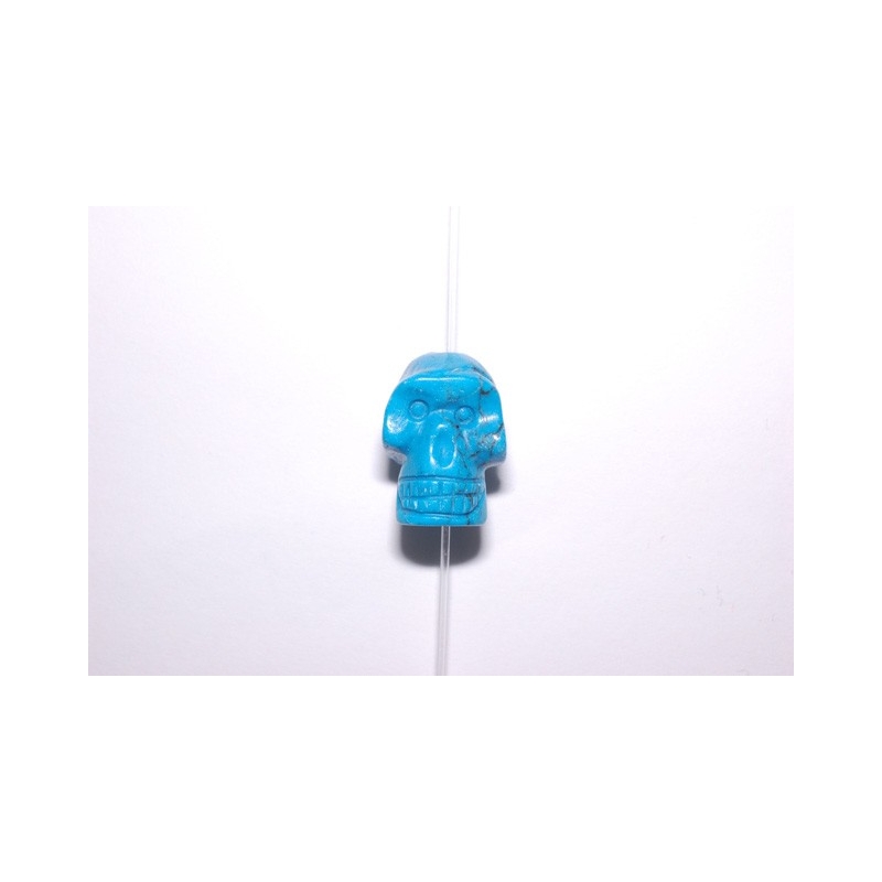 Dødningehoved af turkis. Hullet går ned igennem hovedet. Str. ca. 12 x 11 x 9 mm. Hulstr. er ca. 1,2 mm. Prisen er for1 streng med ca. 30 stk.