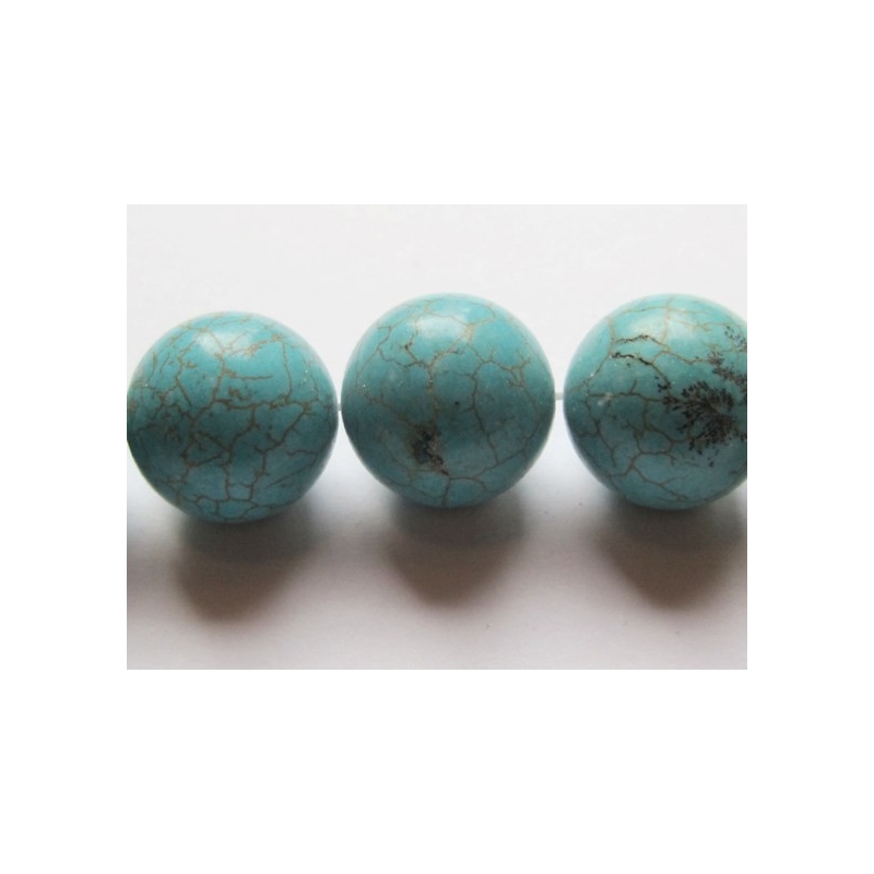 Runde turkise perler - indfarvet turkis. Str. på perler: ca. 16 mm. Hulstr.: ca. 1 mm. Prisen er for 1 streng med ca. 24 stk.