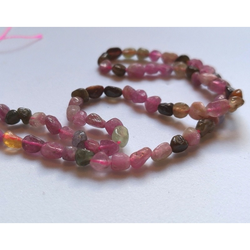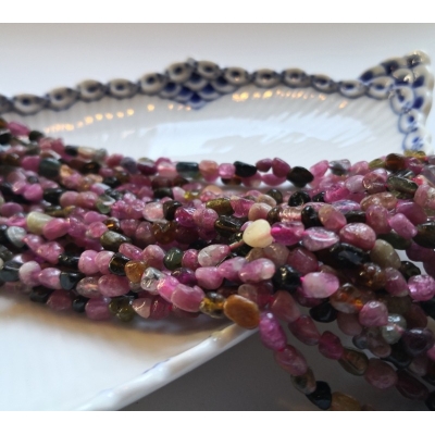Chips / nuggets af turmalin - i alle mulige skønne former og størrelser. Str. ca. 4 x 6 mm. Tykkelse: ca. 2-5 mm. Hul str. ca. 0,4 mm. Antal på streng: ca. 190 stk. Prisen er for 1 streng.