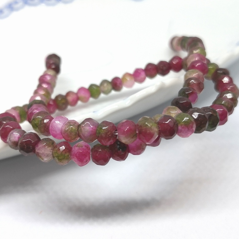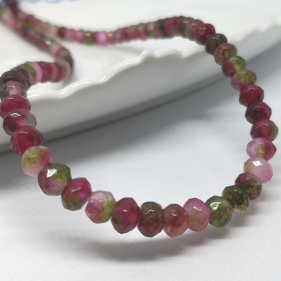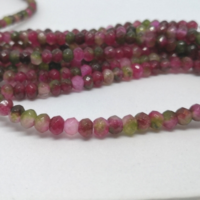 Facetslebne rondeller af turmalin i flere farver. Str.: ca. 4 x 6 mm. Antal på streng: ca. 80 stk. Hul str.: ca. 1,0 mm. Prisen er for 1 streng.