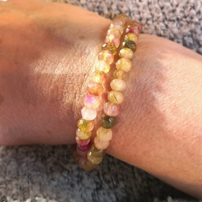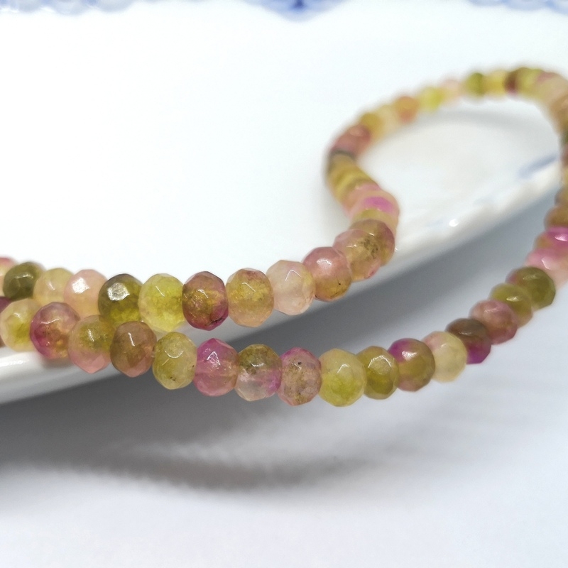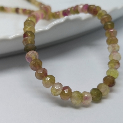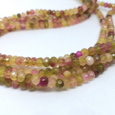 Facetslebne rondeller af turmalin i flere farver. Str.: ca. 4 x 6 mm. Antal på streng: ca. 80 stk. Hul str.: ca. 1,0 mm. Prisen er for 1 streng.