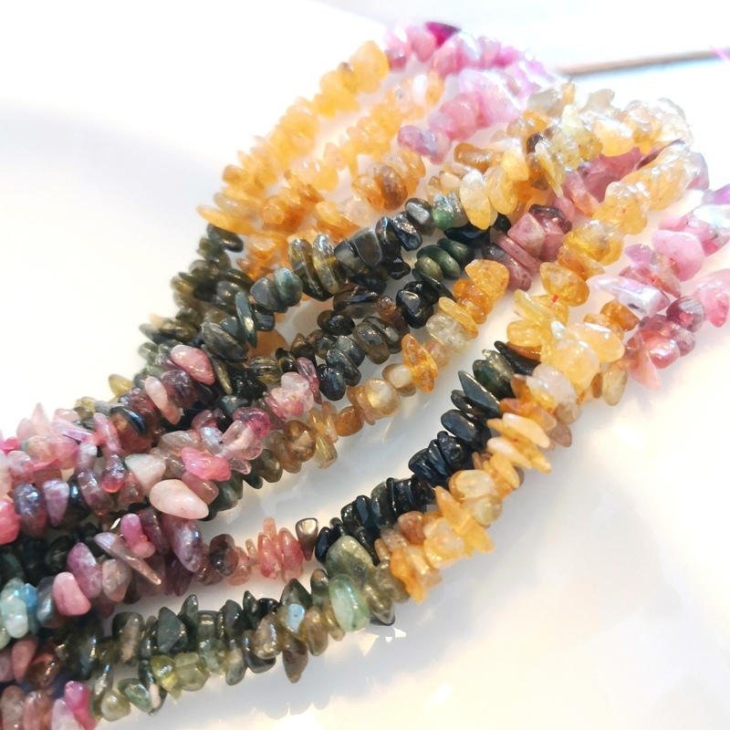Perler af turmalin i flere farver - varierende i form og størrelse. Str.: ca. 3-5 x 3-4 mm. Antal på streng: ca. 85 stk. Hul str.: ca. 0,6 mm. Prisen er for 1 streng.