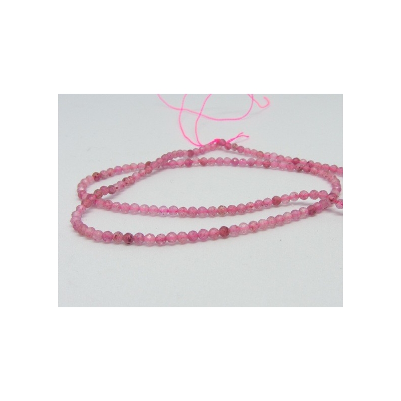 Facetslebne runde perler af turmalin - pink. Str.: ca. 3 mm. Antal på streng: ca. 150 stk. Hul str.: ca. 0,6 mm. Prisen er for 1 streng.