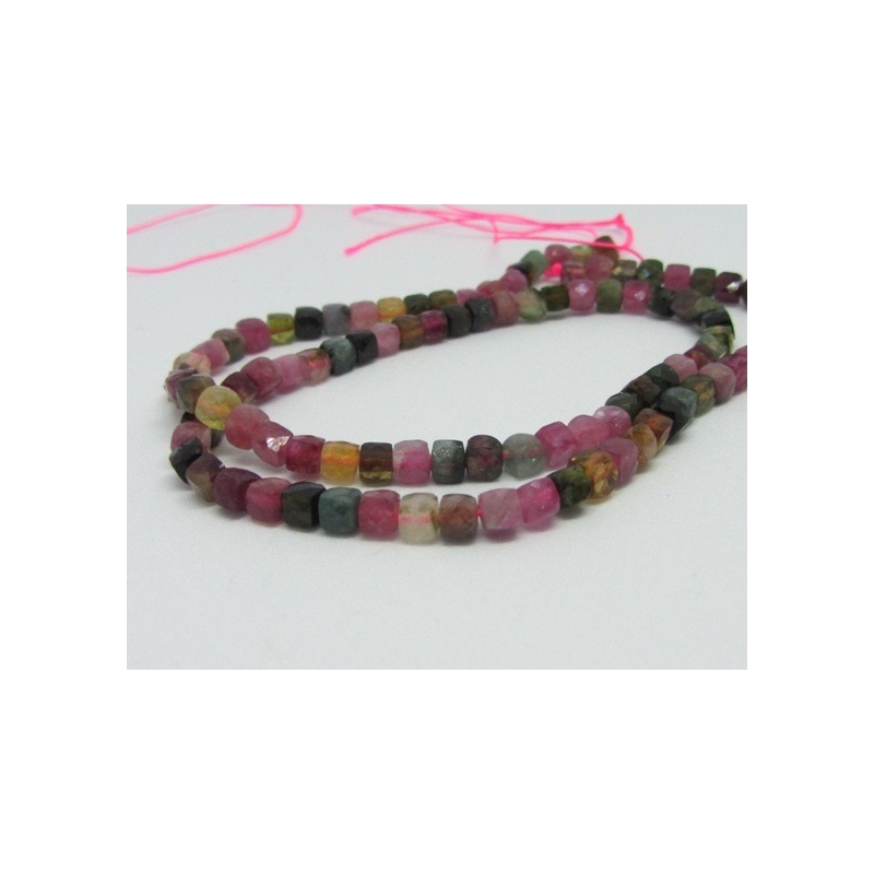 Facetslebne firkantede perler af turmalin i flere farver. Vi vælger farven og finder nogle, der er pænt ens. Str.: ca. 4 x 4 mm. Hul str.: ca. 0,6 mm. Prisen er for 2 stk.