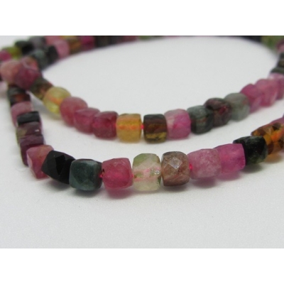 Facetslebne firkantede perler af turmalin i flere farver.