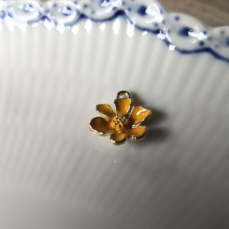 Forgyldt blomst af messing med hvid emalje. Str. ca. 12 mm. Str. med vedhænget ca. 14 mm. Hul str. ca. 1,4 mm. Prisen er for 2 stk.