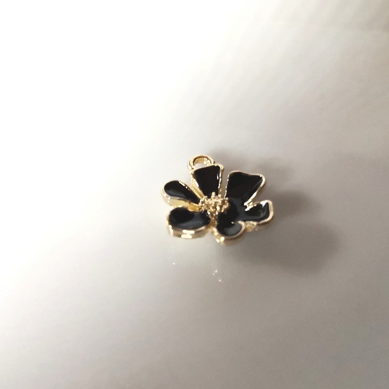 Forgyldt blomst af messing med lyserød emalje. Str. ca. 14 mm. Str. med vedhænget ca. 16 mm. Hul str. ca. 1,4 mm. Prisen er for 2 stk.