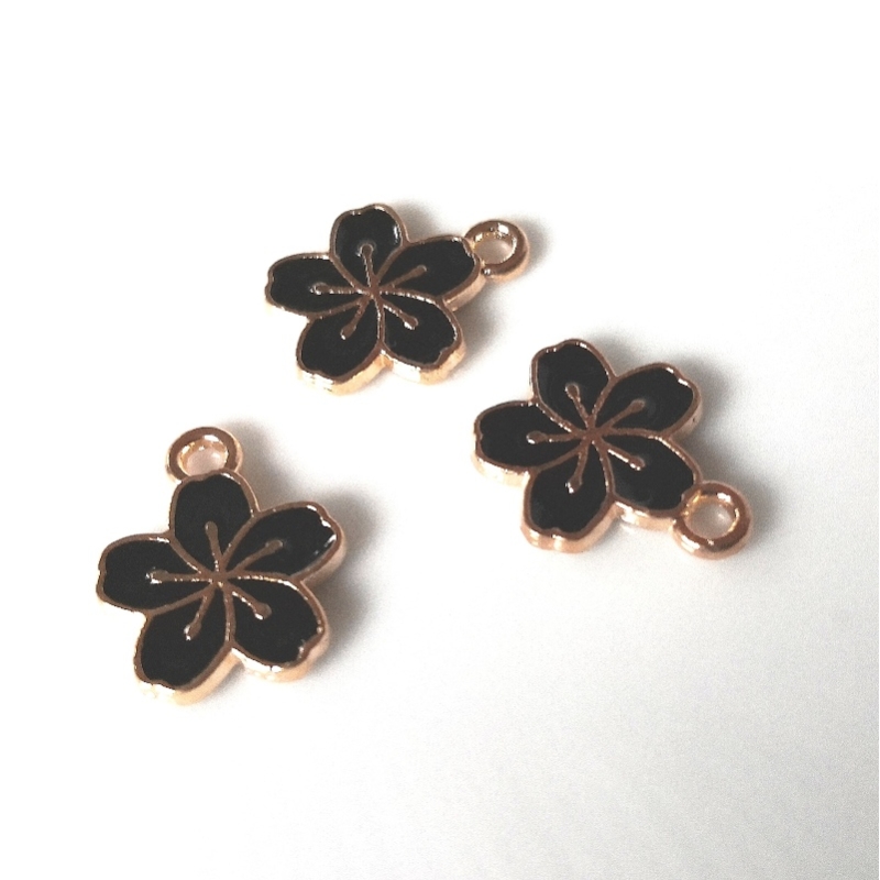 Forgyldt blomst af messing med hvid emalje. Str. ca. 12 mm. Str. med vedhænget ca. 14 mm. Hul str. ca. 1,4 mm. Prisen er for 2 stk.