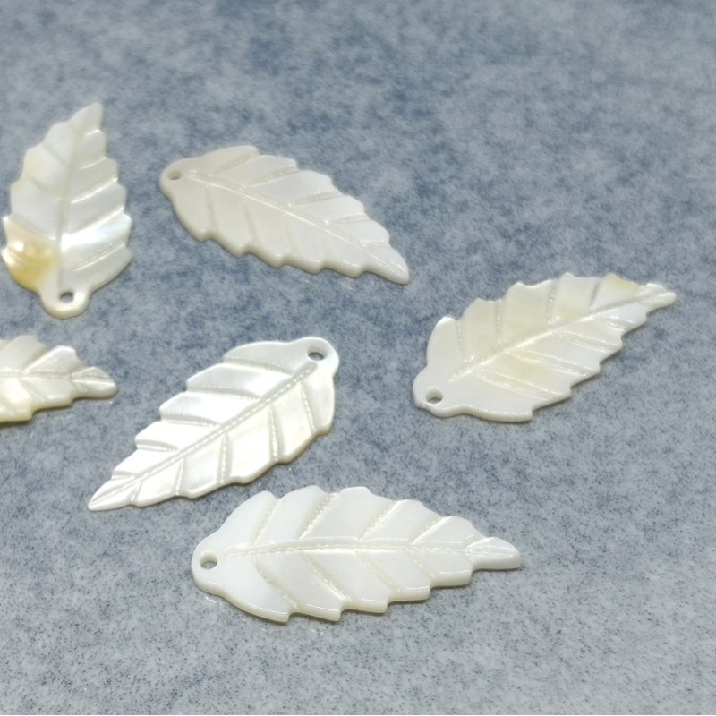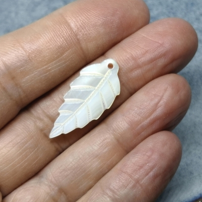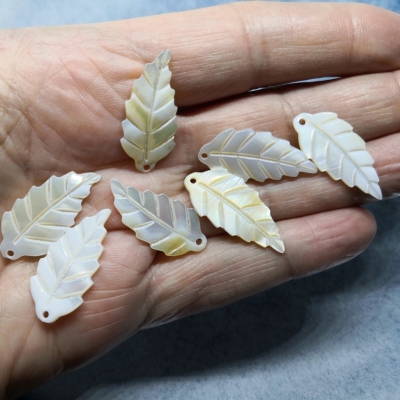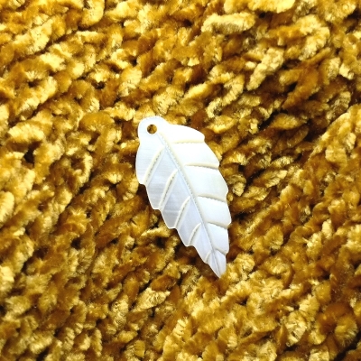 Blad vedhæng af guld farvet messing. Str. ca. 11 x 6,5 mm. Hul str. i øje ca. 1,2 mm. Prisen er for 2 blade.